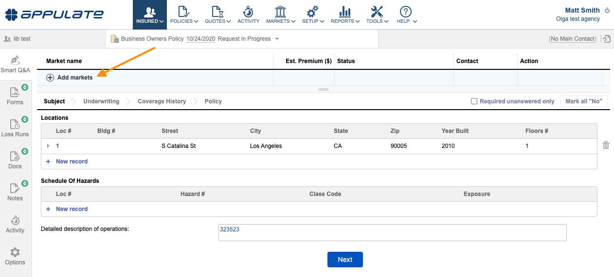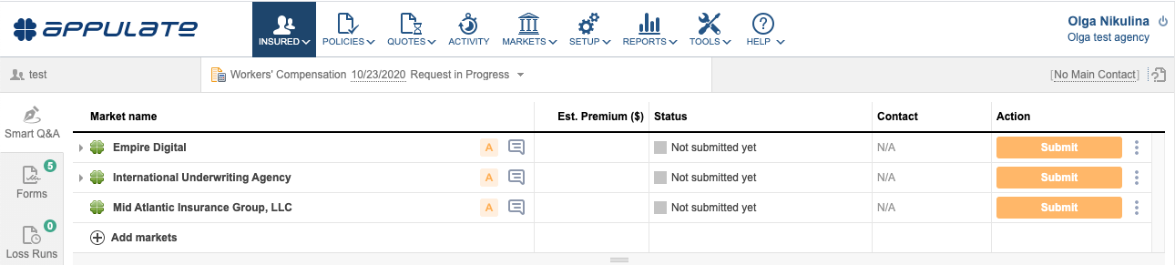 Note: The “Add markets” button is hidden if your company is a captive agency.