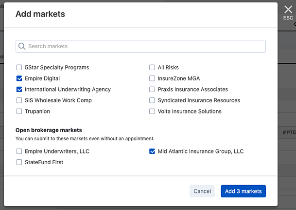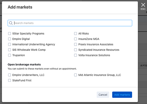 Note: Only open brokerage markets that support the current insurance line, and with configured Appulate, eSubmission, or Weblink submission types will appear in this dialog.